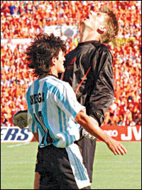 این طرف اما آرژانتین قرار نیست به هلند ببازد. این لیونل مسی است که به اندیشههای فان خال میبازد. آرژانتین مربی ندارد، از پس تیم منسجم هلند بر نمیآید و در غیاب یک مدیر با تجربه رو به بازی احساسی خواهد آورد. همانطور که در جام جهانی ۹۸ به هلند باخت. دوستداران هلند و آرژانتین به خاطر دارند در آن دوره هنگامی که بازی با نتیجه یک بر یک دنبال میشد، هلند ده نفره شد و همه چیز داشت به سود آرژانتین پیش میرفت. آنها میتوانستند با یک بازی منطقی و بهرهگیری از برتری عددی خود نارنجیها را حذف کنند. اما طبق معمول احساس بر منطق فوتبال آرژانتین چربید. آریل اورتگا در محوطه جریمه خود را به زمین زد تا مگر برای تیمش پنالتی بگیرد، اما موفق نشد. همان کاری که روبن مقابل مکزیک خیلی هنرمندانه انجام داد و البته موفق هم شد. وقتی ادوین فاندرسار در اعتراض به این تمارض اورتگا به سرعت بالای سر او دوید، اورتگا بلند شد و با ضربه سر شدیدی که به زیر فک دروازهبان هلند کوبید او را نقش بر زمین کرد. مهره کلیدی آرژانتین از بازی اخراج شد و ورق به نفع هلند برگشت. در نهایت این دنیس برگکمپ خلاق بود که کار آرژانتین را تمام کرد. تازه در نظر بگیرید در آن جام آرژانتین چه پر مهره بود. گابریل باتیستوتا، خوان ورون، دیگو سیمونه، کارلوس روآ در درون دروازه، همین اورتگا که برای خودش نیمچه مارادونایی بود و مهمتر از همه مربی پرآوازهای مانند دانیل پاسارلا بر روی نیمکت. آن روز که روز آرژانتین بود، همه چیز را از دست داد، چه رسد به امروز که فان خال با تجربهتر جانشین گاس هیدینگ شده است.